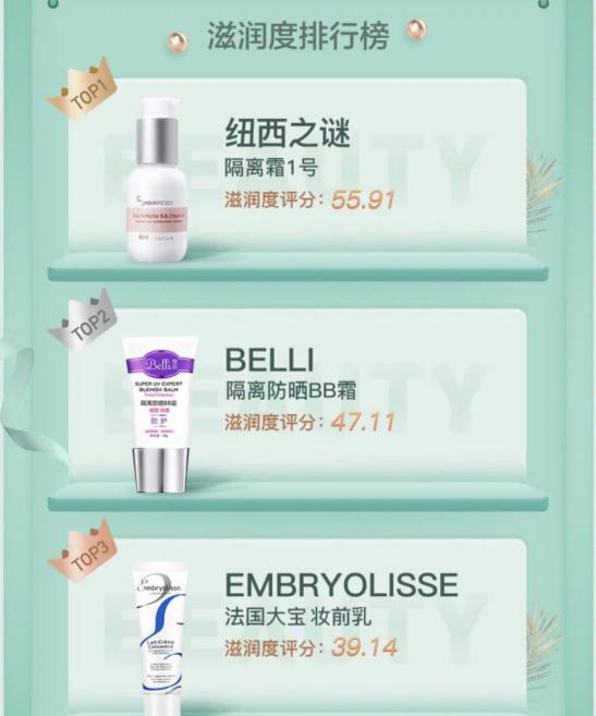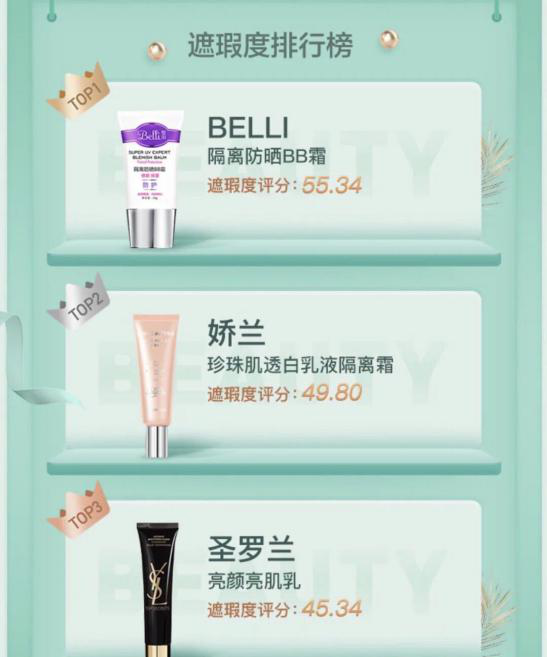 《beauty小姐》第二季正在火熱開播。作為國內首檔以浴室為載體種草類美妝護膚綜藝欄目,以1:1還原嘉賓浴室為亮點,搜羅嘉賓生活好物,分享生活方式、探討美妝觀念。每期還會針對一類美妝護膚產品進行科學測評。為用戶提供科學便捷的種草路徑,有效傳達更健康的生活觀念與美妝理念。 本期由明星嘉賓與大家分享美妝、護膚保養心得,隔離一直是愛化妝女生的必選 " 裝備 ",為了讓各位仙女們在春季時刻保持肌膚水潤不脫妝,成為春季出行亮點,本期《Beauty 小姐》就邀請眾嘉賓共同探討了關于妝前隔離的美妝護膚心得。 經過之前全網用戶的票選,共有 100 款妝前隔離參與第二輪的評測。該評測由中國檢驗檢疫科學研究院進行,綜合考慮多項指標,并重點對重金屬、化學防曬劑等 "9 X" 項有爭議的成分進行嚴格審核,甄選出十款妝前隔離組成了本次的 Beauty 公信榜。 一般來說,妝前隔離的功效大致有三種:隔離紫外線和空氣污染,隔離彩妝對皮膚的刺激以及調整膚色不均。而三億女生針對妝前隔離的消費數據來看在選購妝前隔離時 43% 的人更關注均勻膚色的效果,20% 的人更關注滋潤保濕效果,16% 的人更關注遮瑕效果。 經過嚴苛的層層篩選,把100款隔離產品按照均勻膚色、滋潤保濕、遮瑕三大細分維度進行比較。終于誕生了本次公信榜裝妝前隔離乳的TOP1!——Belli隔離防曬bb霜!