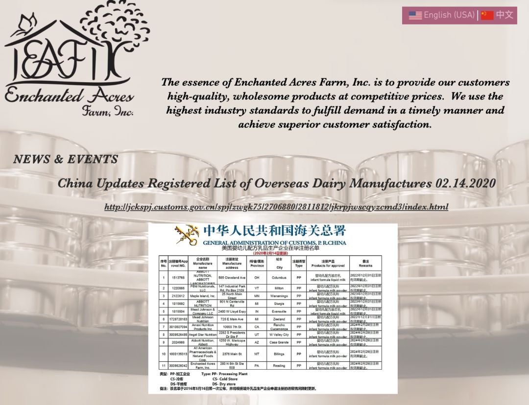 雅培旗下一家名為“Abbott Nutrition, Abbott Laboratories”的工廠也獲得注冊資格。資料顯示,該工廠位于美國亞利桑那州的卡薩格蘭德市。 在當地媒體2017年發布的一則關于雅培上述工廠的消息中,雅培工廠總監Troy Rosenow表示:“在卡薩格蘭德,我們每天運出和運入的營養品中大約有一半是面向國際市場上的消費者和患者。” 雅培此前一家注冊了嬰幼兒配方液態乳的工廠并未出現最新名單中。海關發布去年12月消息曾表示,在2019年底注冊期屆滿時,雅培主動提出注銷一家美國工廠的注冊資格,該廠注冊產品為嬰幼兒配方液態乳。 All American Pharmaceuticals & Natural Foods Corp.位于美國蒙大拿州的Billings(比靈斯)。公開資料顯示,這家位于Billings的工廠有150,000平方英尺。 其官網資料顯示,該公司既研發和生產自己的食品和營養品系列,也生產自有品牌及為眾多客戶生產定制配方的產品,其創始人兼執行科學家是Jeff Golini博士。除了嬰幼兒配方乳粉,這家公司還生產面霜、乳液等美妝產品,以及草藥提取物等產品。 最后,美國注冊名單中新增的還有一家Enchanted Acres Farm, Inc.,位于美國賓西法尼亞州的Reading(雷丁)。 該公司將海關總署近日更新的注冊名單顯眼地掛在了首頁。官網資料顯示,該企業成立于2002年,并在2010年搬遷至雷丁。這家食品工廠占地400,000平方英尺,位于主要航運港口附近,交通便利。 據官網介紹,該公司具備“完整的制造和供應鏈解決方案”,生產一至三段的嬰兒配方奶粉和營養粉飲品。所有產品均在美國當地生產。據悉,該公司的配方奶粉符合FDA、CFD和CFD和CNCA(中國認監委)的要求。