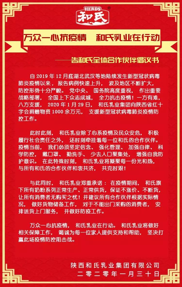作為關(guān)乎到“祖國(guó)下一代健康茁壯成長(zhǎng)”的母嬰企業(yè),作為每一位秉承愛心、良心、責(zé)任心的母嬰人,在疫情爆發(fā)的第一時(shí)刻,都以自己的方式表現(xiàn)出眾志成城的決心。除了捐資捐物,最大限度為疫區(qū)貢獻(xiàn)力量之外,更多的母嬰人都在自己的位置上堅(jiān)持著,努力著,奮斗著,隔離不隔愛,封城不孤城,在這特殊而關(guān)鍵的時(shí)刻,通過各項(xiàng)舉措,堅(jiān)決握緊中國(guó)寶寶的奶瓶,傳遞信念傳承愛,和氏乳業(yè),就是其中之一! 為“愛”護(hù)航,補(bǔ)貼實(shí)體經(jīng)營(yíng),履行社會(huì)責(zé)任 疫情當(dāng)下,實(shí)體經(jīng)濟(jì)困難重重,尤其是我們的合作伙伴面臨著巨大的壓力,和氏作為品牌方,看在眼里,急在心頭。第一時(shí)間向疫區(qū)捐獻(xiàn)1000余萬元物資,同時(shí)啟動(dòng)超過5000萬補(bǔ)貼的一級(jí)預(yù)案措施,為廣大合作伙伴暫解圍困之局。其中包括并不限于:疫情期間,為全國(guó)所有合作經(jīng)銷客戶、終端門店、消費(fèi)者提供物流、運(yùn)營(yíng)、送貨上門等增值服務(wù)。