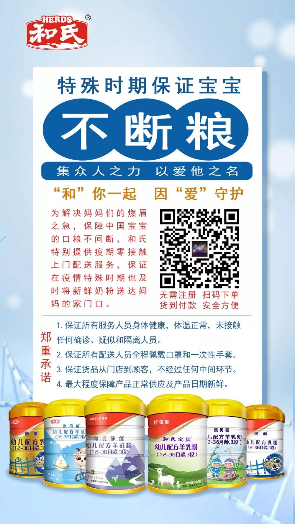 為“愛”守候,全力以赴,解決千萬媽媽后顧之憂 疫情就是命令,防控就是責(zé)任。但請(qǐng)相信隔離不隔愛,抗擊病毒,人人有責(zé),為了解決寶寶口糧問題,解決千萬媽媽燃眉之急,保障寶寶的口糧不間斷,和氏采取全方位多渠道模式,通過線上電商平臺(tái)、客戶咨詢熱線、實(shí)體母嬰店聯(lián)合、導(dǎo)購專項(xiàng)服務(wù)等等,以最快速、最安全、最便捷的方式,為千萬家庭傳遞暖心服務(wù),解決媽媽們的燃眉之急。 與此同時(shí),和氏全面啟動(dòng)“掃碼下單,直接配送”服務(wù),特殊時(shí)期,給您特別的關(guān)懷。消費(fèi)者可根據(jù)自己的需求,通過掃碼填寫所需奶粉品類、數(shù)量及段位,和氏就將在第一時(shí)間送貨上門,保證寶寶口糧新鮮安全。