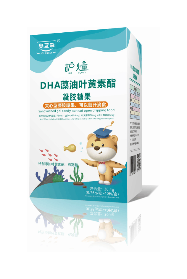 奧藍森護燑DHA藻油葉黃素酯凝膠糖果 夾心型凝膠糖果,可以剪開滴食 每粒添加DHA藻油375mg(含DHA150mg)、葉黃素酯50mg(含葉黃素酯5mg)