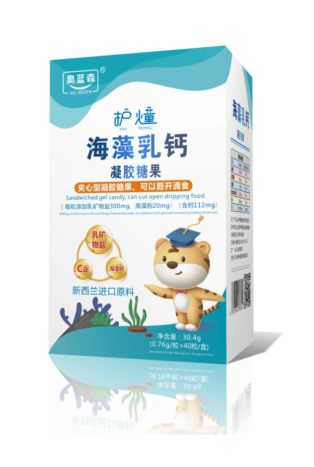 奧藍森護燑海藻乳鈣凝膠糖果 夾心型凝膠糖果,可以剪開滴食 每粒添加乳礦物鹽300mg、海藻粉20mg、含鈣112mg