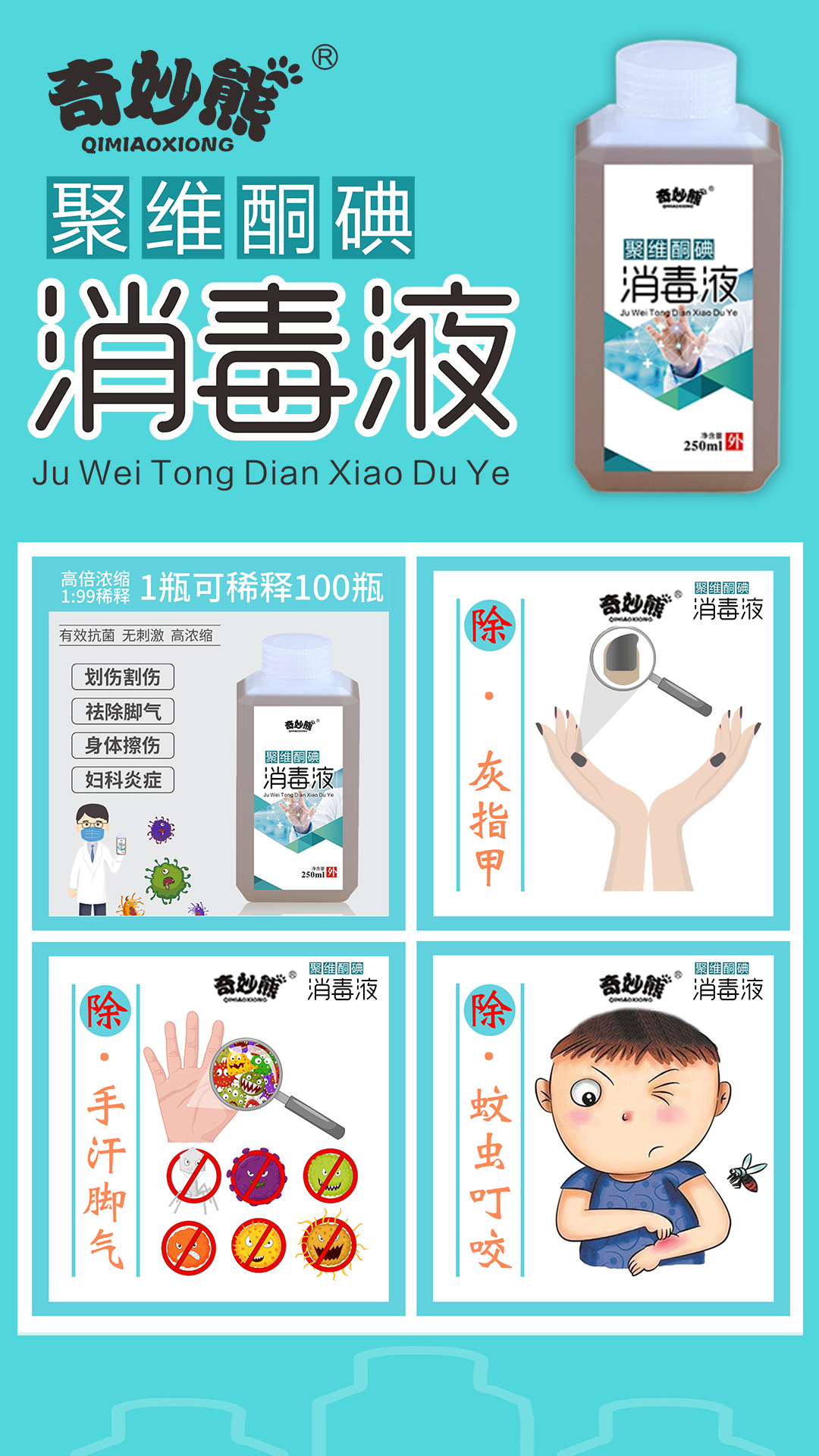 4、餐具和食具的消毒。 5、手術部位的皮膚消毒。 6、對有真菌引起的腳氣、腳汗、腳臭可緩解 奇妙熊聚維酮碘消毒液可用于注射消毒、環境消毒、洗手消毒、傷口消毒等,360°全方位抑菌消毒,給你更多防護需求。 |