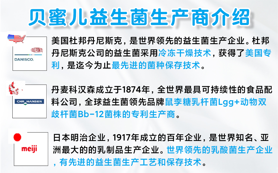 此次新品貝蜜兒益生菌,采用國家衛(wèi)計委公告可用于嬰幼兒食品的菌株,每袋含有6聯(lián)進口益生菌,使用的菌株HN001、HN019、Bi-07、Lgg、Bb-12、M-16V,來源于美國杜邦、丹麥科漢森及日本明治,均是有大量國內(nèi)和國際臨床研究驗證的,耐胃酸耐膽汁、安全的菌株。